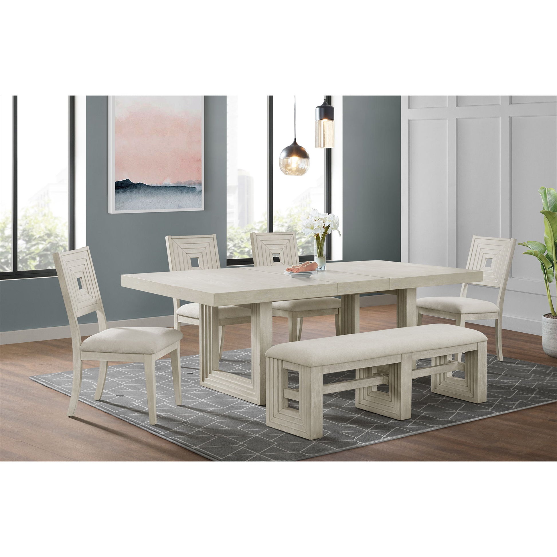 Avalanche - 6 Piece Standard Height Dining Set (Table, Four Chairs & Bench) - Antique White