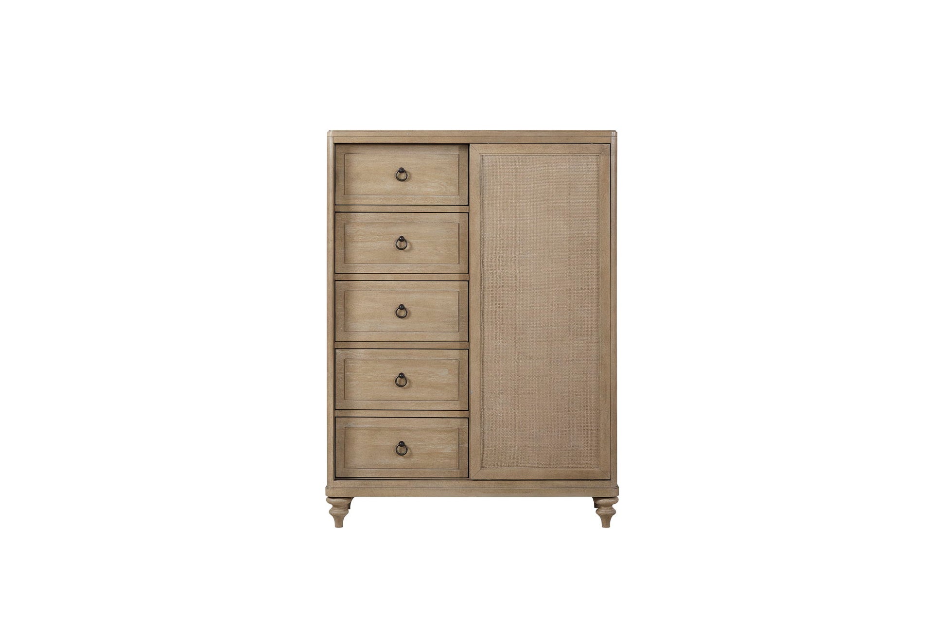 Introducing the Citrus Heights Door Chest, a fusion of elegance and functionality designed to elevate your living space with its exquisite craftsmanship and versatile storage solutions. Crafted from premium Mindi veneer, this chest boasts a luxurious sand color finish, adding a touch of sophistication to any room. Equipped with five spacious drawers and a convenient sliding door closet, this piece offers ample storage to keep your belongings organized and easily accessible. Each drawer glides smoothly on ball bearing guides, ensuring effortless opening and closing, while the sliding door provides discreet storage for larger items. Embracing a transitional casual lifestyle design, the Citrus Heights Door Chest seamlessly blends modern aesthetics with timeless charm, making it a perfect addition to any décor theme. Whether placed in your bedroom, living room, or hallway, it serves as both a functional storage solution and a statement piece of furniture. Elevate your home with the Citrus Heights Door Chest and experience the perfect balance of style and practicality.
