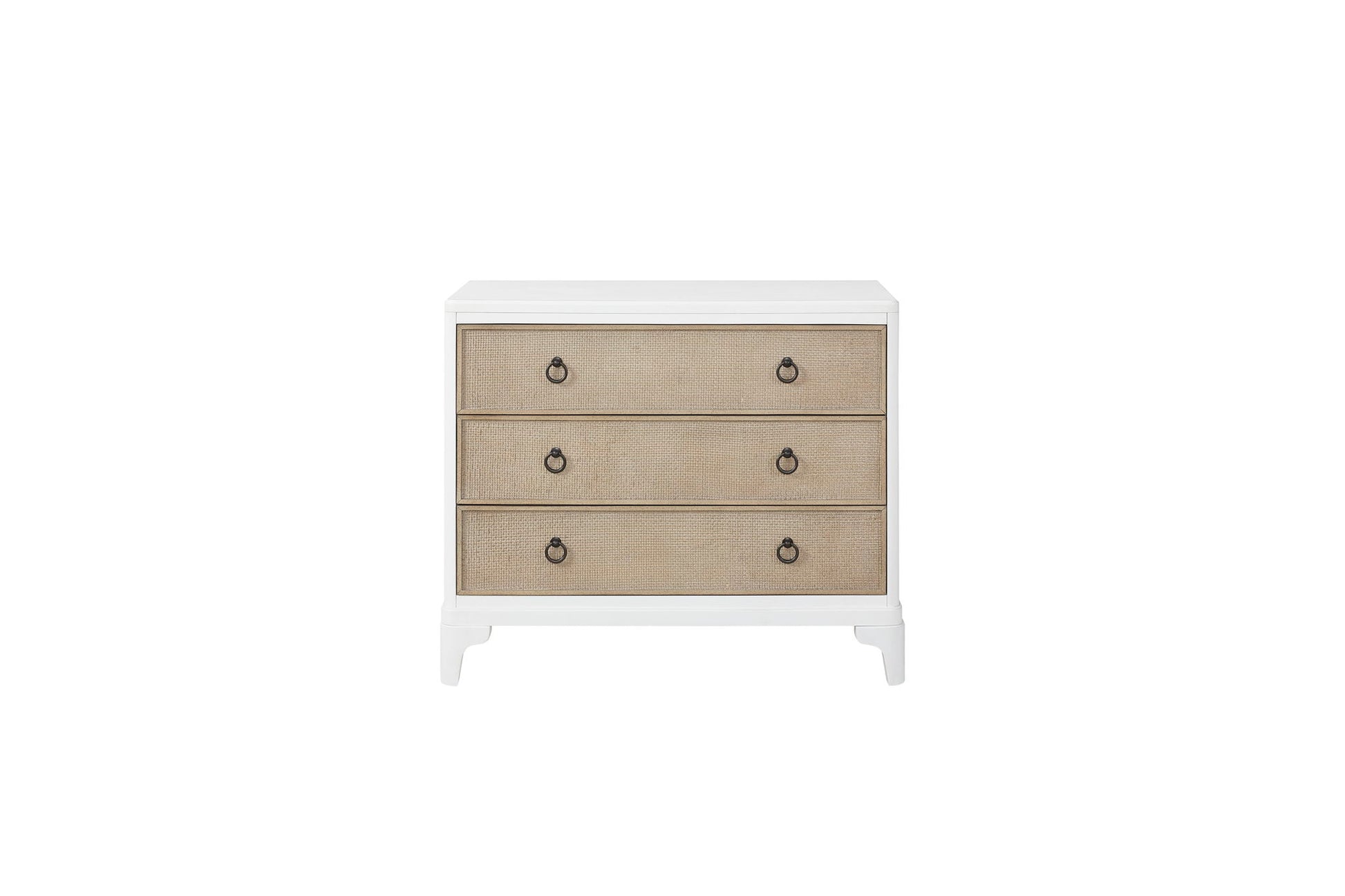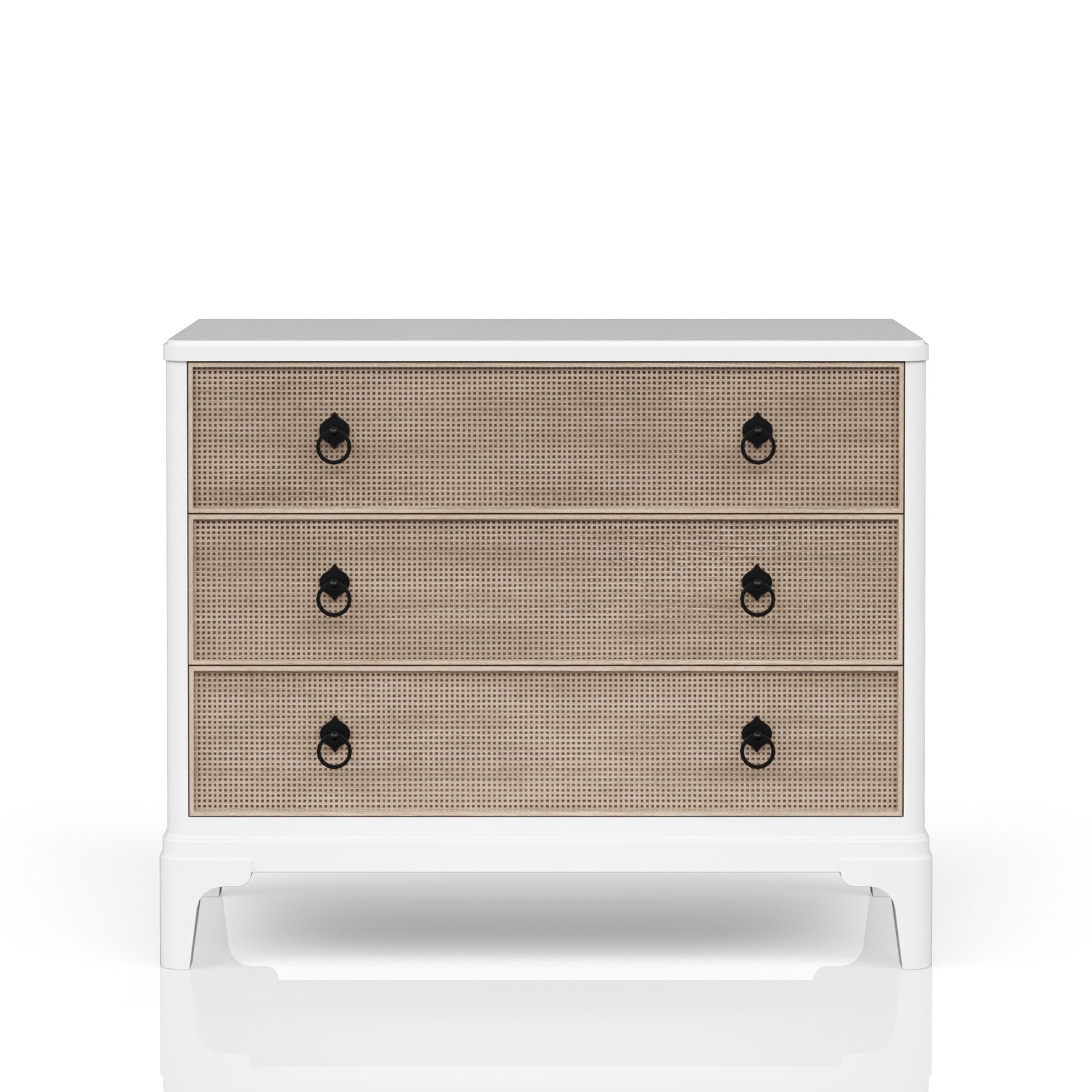 Introducing the Citrus Heights Hall Chest, an exquisite addition to your home decor that seamlessly blends transitional charm with casual elegance. Crafted with precision and attention to detail, this hall chest features a pristine white painted finish that radiates a sense of freshness and sophistication. Constructed with Mindi veneers, this chest boasts both durability and beauty, ensuring longevity and timeless appeal. The incorporation of cane face drawers adds a touch of texture and visual interest, elevating its aesthetic appeal to new heights. Designed for practicality, the Citrus Heights Hall Chest offers three spacious storage drawers, providing ample room to organize and store your essentials with ease. Whether it's stowing away daily necessities or displaying cherished decor pieces, this chest caters to your storage needs effortlessly. Embracing a wire-brushed finish, each surface of this chest exudes a subtle rustic charm, adding depth and character to its appearance. The transitional design allows it to seamlessly complement a variety of interior styles, from traditional to contemporary, making it a versatile and adaptable piece for any space. Equipped with ball-bearing guides, the drawers glide smoothly open and closed, ensuring easy access to your belongings while maintaining stability and reliability. Elevate your living space with the timeless allure of the Citrus Heights Hall Chest, where functionality meets impeccable craftsmanship in a harmonious blend of style and practicality.