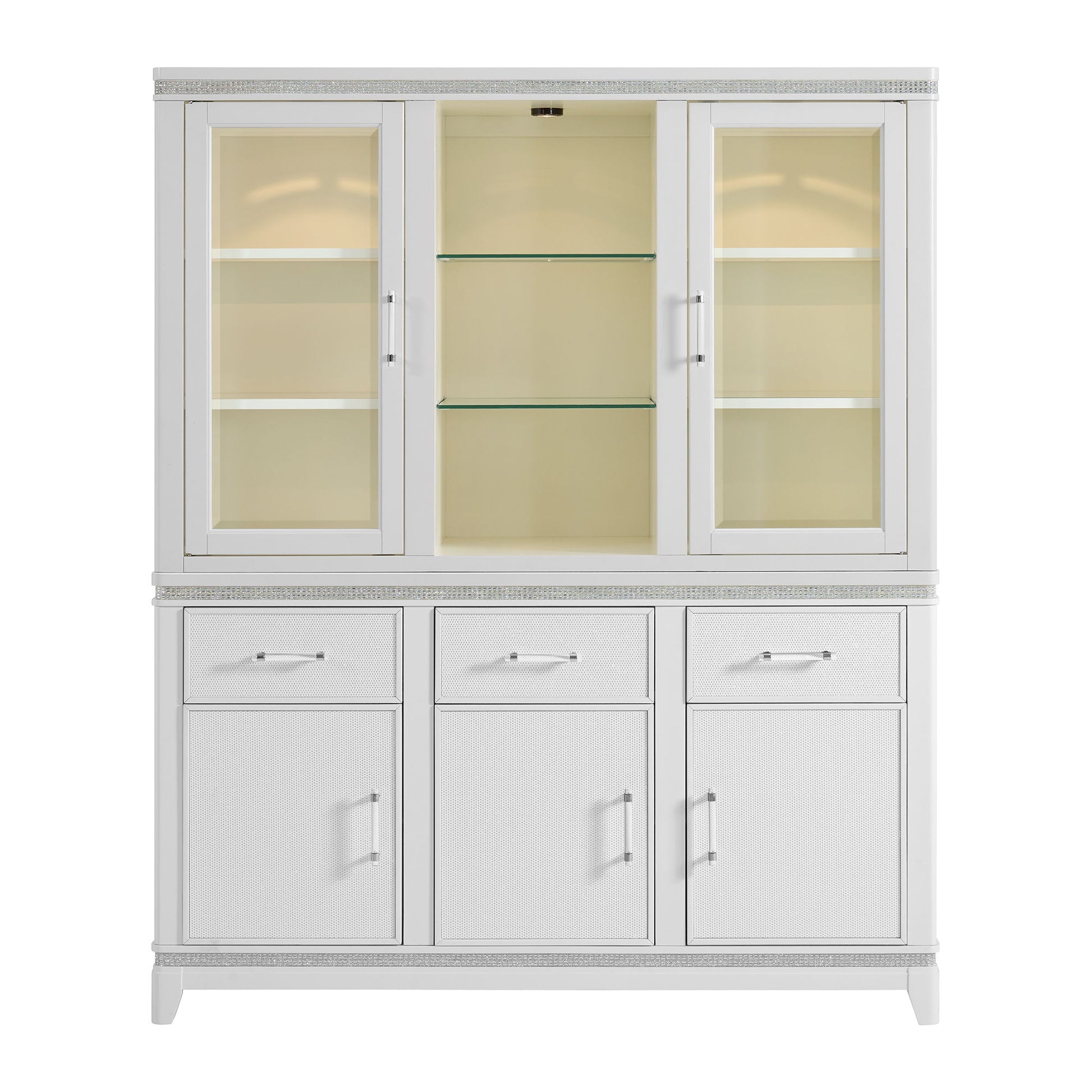 Enrich your dining room with the showstopping style of the Diedra Server and Hutch. Accented with LED lighting, glass door fronts, acrylic knobs, and rhinestone detailing, the exuberance of glam style is woven into every inch of these stunning pieces. Adjustable shelving in both the hutch and server allows you to customize your storage and display space, while felt-lined top drawers in the server are included to protect the furniture and its contents alike. Made with solid wood framing and finished in a quality birch veneer, the Diedra Server and Hutch is the perfect statement of quality and style.