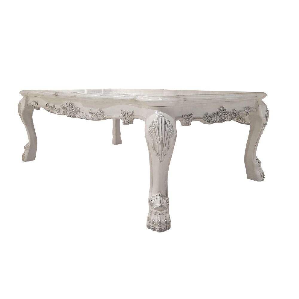 The widely beloved Dresden coffee table is now available in a new antique pearl white finish. The coffee table features the same classic ornamental accents that we all adore such as carved scrolls and scalloped edges. Sitting on traditional claw feet that mimic those of a lion for stability and style. The hand-brushed silver accents help emphasize the beautiful scrollwork.