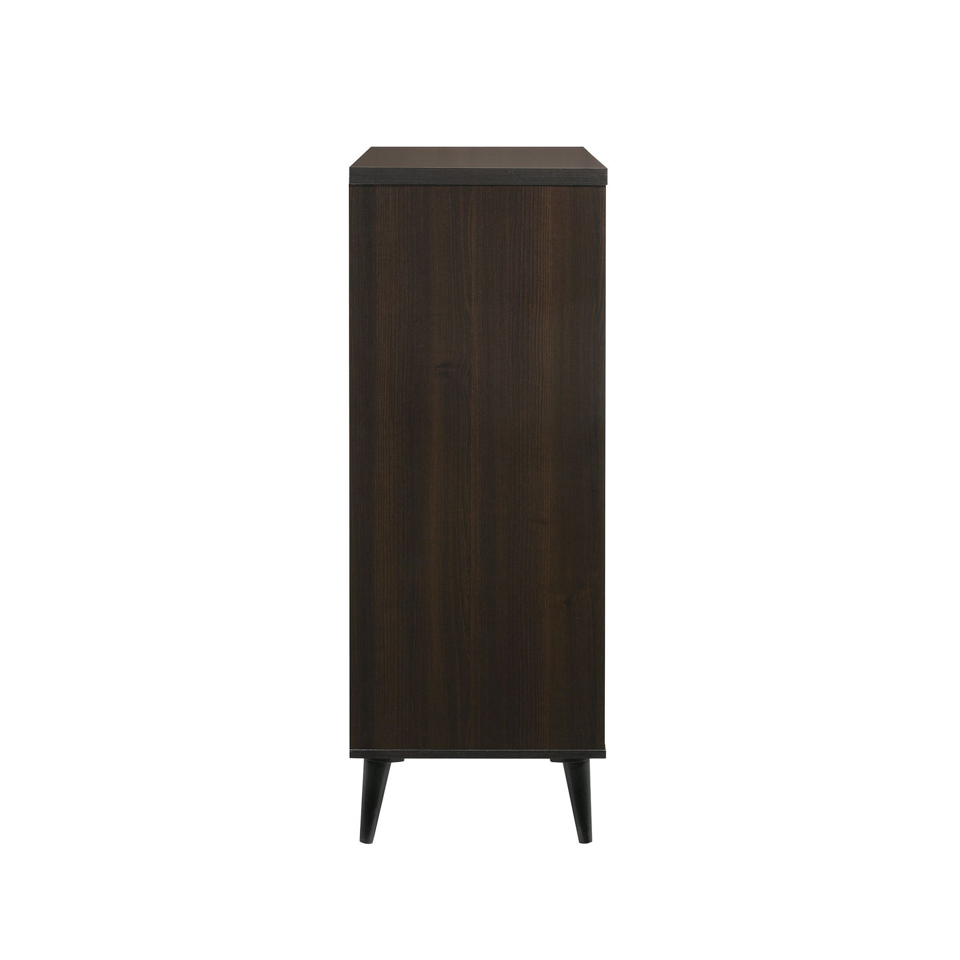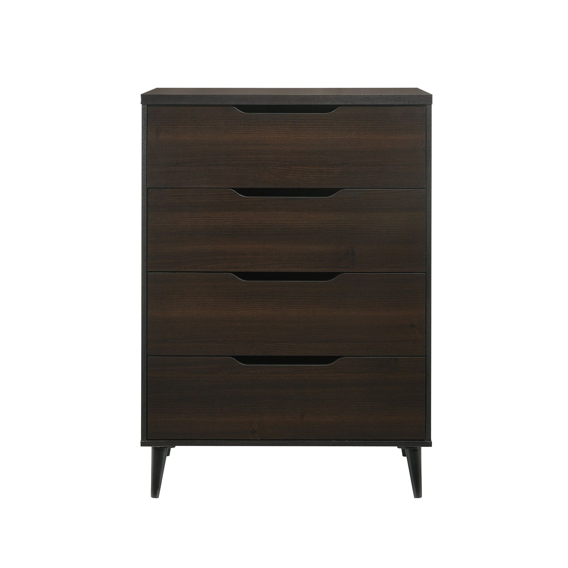 Enhance your bedroom with the sleek and modern Ernesto Chest, designed to offer both style and functionality. Featuring four spacious drawers, this chest provides ample storage for all your essentials. The unique cutout drawer handles add a contemporary touch, while the rich espresso finish showcases beautiful wood grain detailing. Supported by angled legs, the Ernesto Chest offers a stable and stylish base that complements any room. With interlock drawers for added durability, this piece effortlessly combines modern aesthetics with practical design, making it a perfect addition to your home.