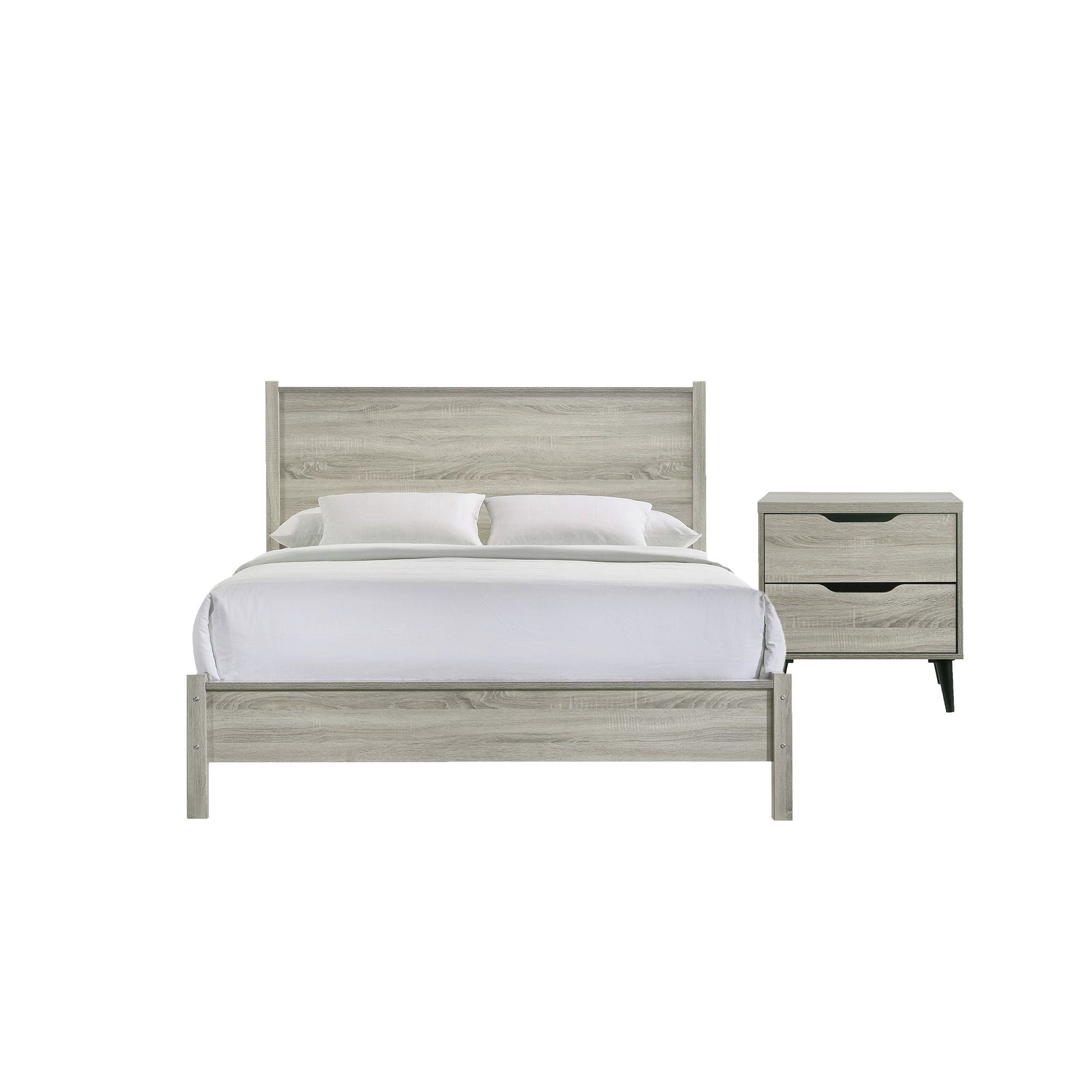 The Ernesto 2PC Queen Panel Bedroom Set is the classic understated set for your dream bedroom. Includes queen bed and nightstand. Constructed of solid manufactured woods for years of use. Wood grain detailing showcases throughout the finish while a grey hue easily complements existing aesthetic. The case pieces provide ample storage for linens, clothing, and more. Features angled legs creating a mid-century design. Slat kit is provided for a seamless setup, no box spring required.