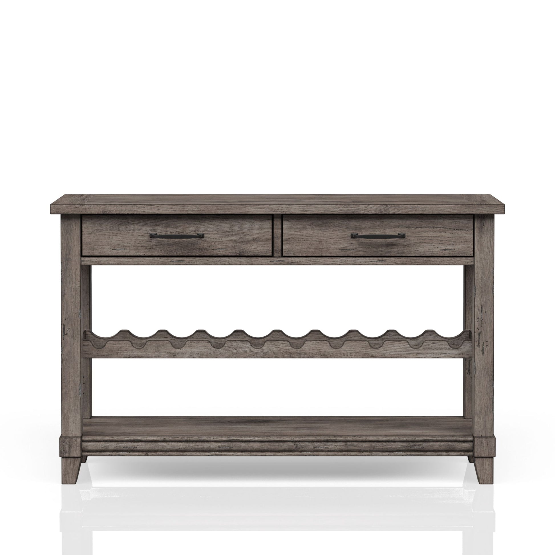 Introducing the Hartford Hallway Accent Table, the perfect addition to any home looking for a touch of casual elegance. This table features a warm grayish brown finish that complements any decor style. The Hartford Hallway Accent Table offers ample storage space with its 10 bottle wine rack, 2 spacious drawers with ball bearing guides, and a bottom shelf for additional storage or display options. The wine rack is designed to securely hold your favorite bottles, while the drawers provide a convenient place to store accessories such as bottle openers or corkscrews. Measuring at 48"W x 14"D x 30 3/8"H, this table is the perfect size for a hallway, foyer, or living room. Its versatile design allows it to be used in various spaces throughout your home. Additionally, this table coordinates with the matching collection pieces, including the Cocktail Table, End Table, and Chairside Table. Crafted with high-quality materials, this table is built to last and withstand daily use. The Hartford Hallway Accent Table is the perfect blend of style and functionality, making it a must-have for any home. Order yours today and elevate the look of your home with this stunning accent piece.