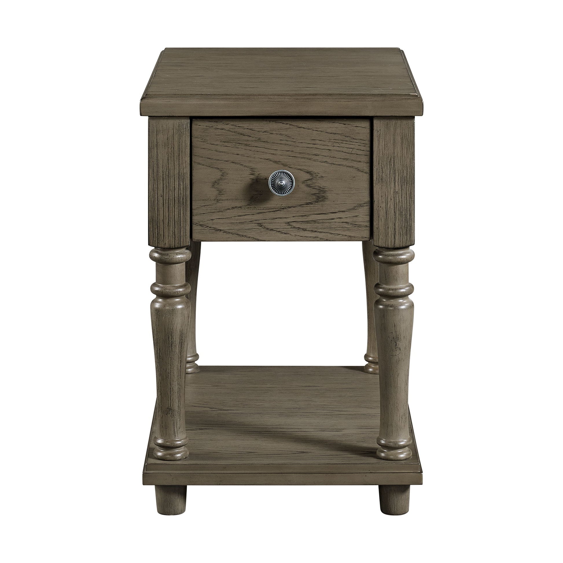 The Kings Court Chairside Table is a stylish and functional addition to your living room or bedroom. Constructed of durable materials including MDF, Rubberwood, and Oak Veneer, this chairside table is built to last. It features a convenient storage drawer for stashing remote controls or other small items, as well as a bottom shelf for additional storage or display space. The table also includes a USB and power strip, making it easy to charge your devices while sitting on the couch or in bed. Grey metal hardware adds a modern touch to this versatile piece of furniture.