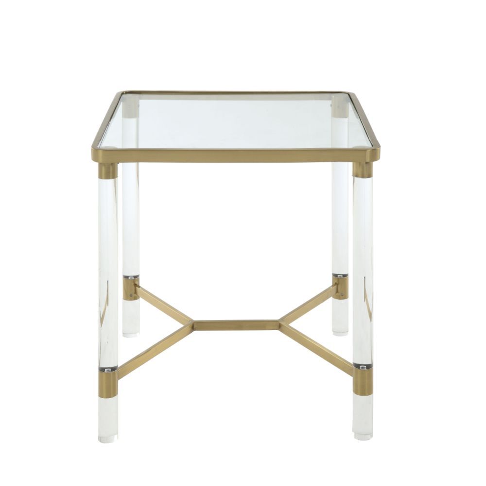 KD, Square Leg End Table • NO Storage (Open Base) • Features: 5mm Clear Glass Top, Gold Finish Stainless Steel Support, Acrylic Round Legs: Clear Finish •• CONSTRUCTION •• Glass Top: 5mm Clear Tempered Glass, NOT Beveled (Fixed Top/No Apron) • Acrylic Round Leg: Clear Finish, Leg Size: 22"H x 1.5"T (560mm, 40mm) • Metal Top Trim & "X" Crossbar Support Frame: Gold Finish, Metal Tube, Stainless Steel with Electro Plating (10 x 10mm)