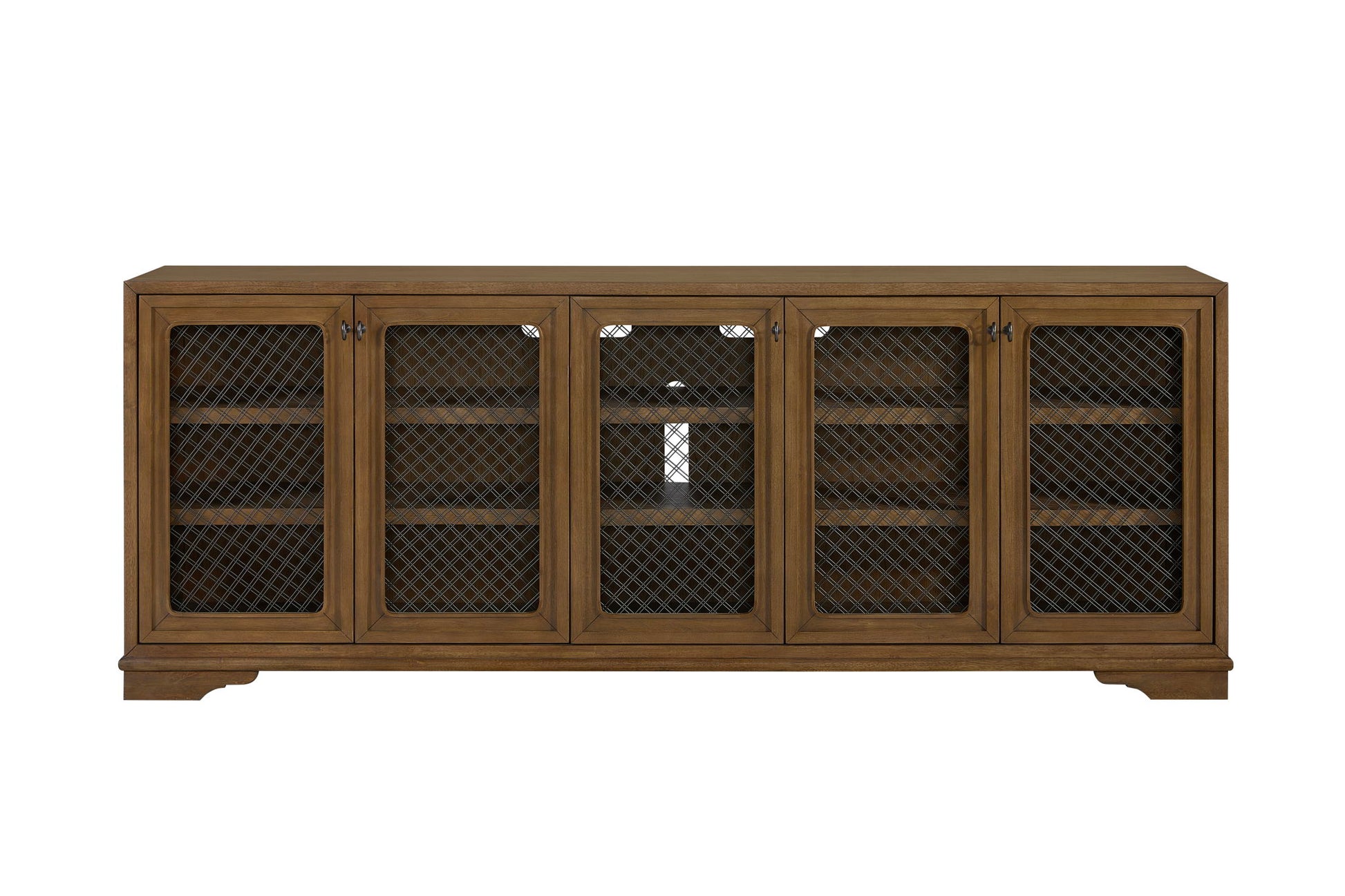 The Tarrington 84" Console is a striking blend of timeless elegance and practical function, crafted with Hickory veneers in a warm Almond finish that highlights the natural wood grain. Designed with transitional appeal, this piece features four framed doors accented with decorative metal mesh fronts, offering a sophisticated touch while providing visibility and ventilation for stored items. Behind the doors, spacious shelving provides ample room for media components, books, or decorative pieces. Built with refined detailing and a sturdy structure, the Tarrington Console is perfect as a statement entertainment unit or as a stylish storage solution in living and dining spaces. Its expansive 84-inch width makes it an ideal centerpiece for large rooms, combining durability, craftsmanship, and elevated design.