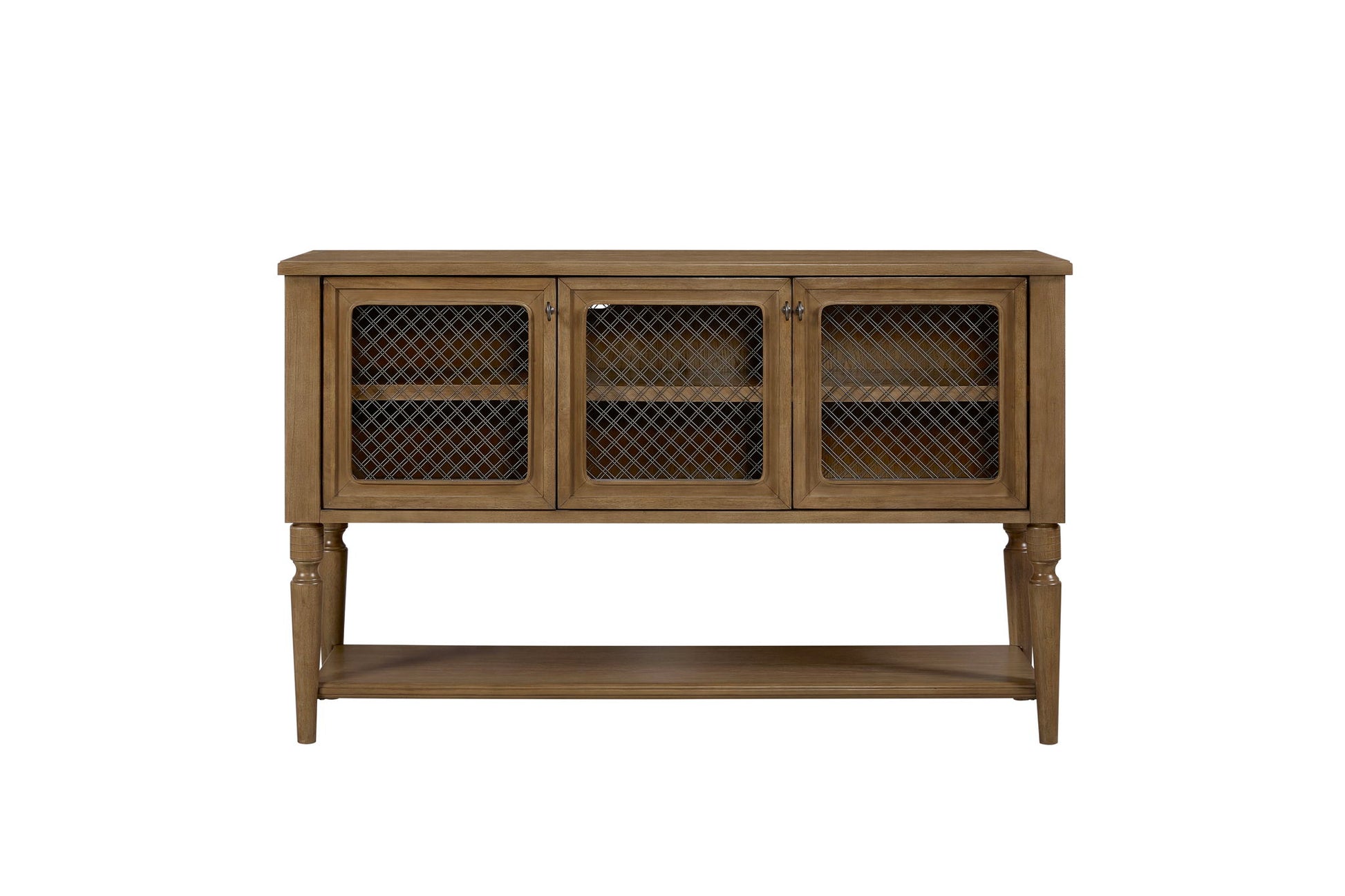 The Tarrington Server with Mesh Door Fronts in finish brings timeless farmhouse character and versatile storage to your dining space. Crafted with durable veneers, this piece features three framed doors accented with decorative mesh fronts, blending rustic charm with a hint of industrial flair. Behind the doors, roomy shelving provides ample space for dishes, glassware, or entertaining essentials, while the open lower shelf adds both storage and display options. The turned legs and warm Almond finish highlight the natural grain of the wood, giving the server a refined yet casual appeal. Perfect for dining rooms or kitchens, it pairs functionality with a stylish, transitional design that fits seamlessly into a variety of interiors.