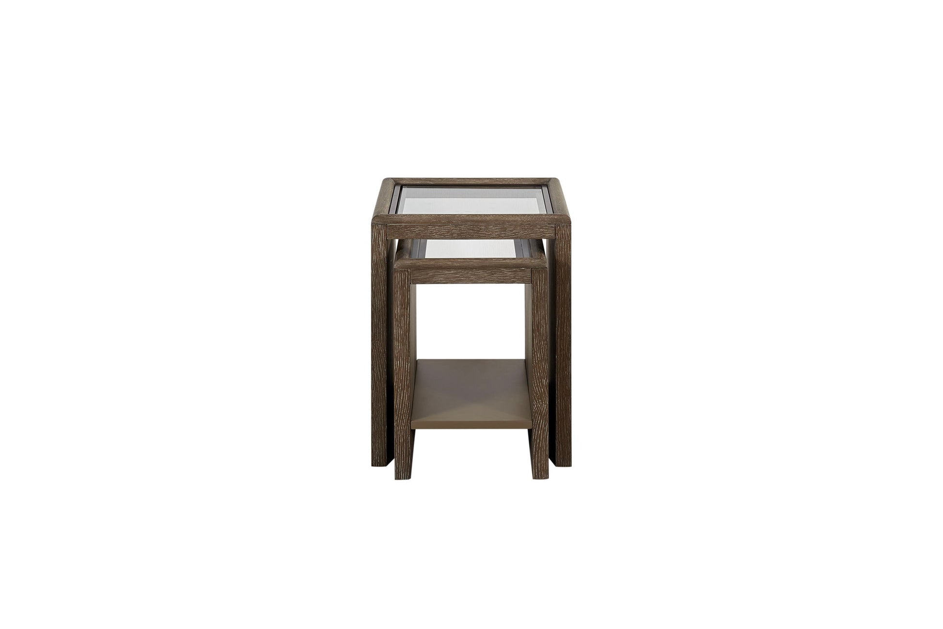 Trilogy Cocoa Nesting Table with Glass Top The Trilogy Cocoa Nesting Table with Glass Top seamlessly blends modern design with functional versatility. Crafted in a rich Cocoa finish, this set features two tables accented by sleek glass tops, adding an airy sophistication to your space. Designed to nest perfectly together, these tables offer flexible use—ideal for small spaces or entertaining. Whether displayed together or separately, their clean lines and subtle detailing bring timeless style to any living room or lounge. Dimensions: 16" L x 16" W x 20.5" H